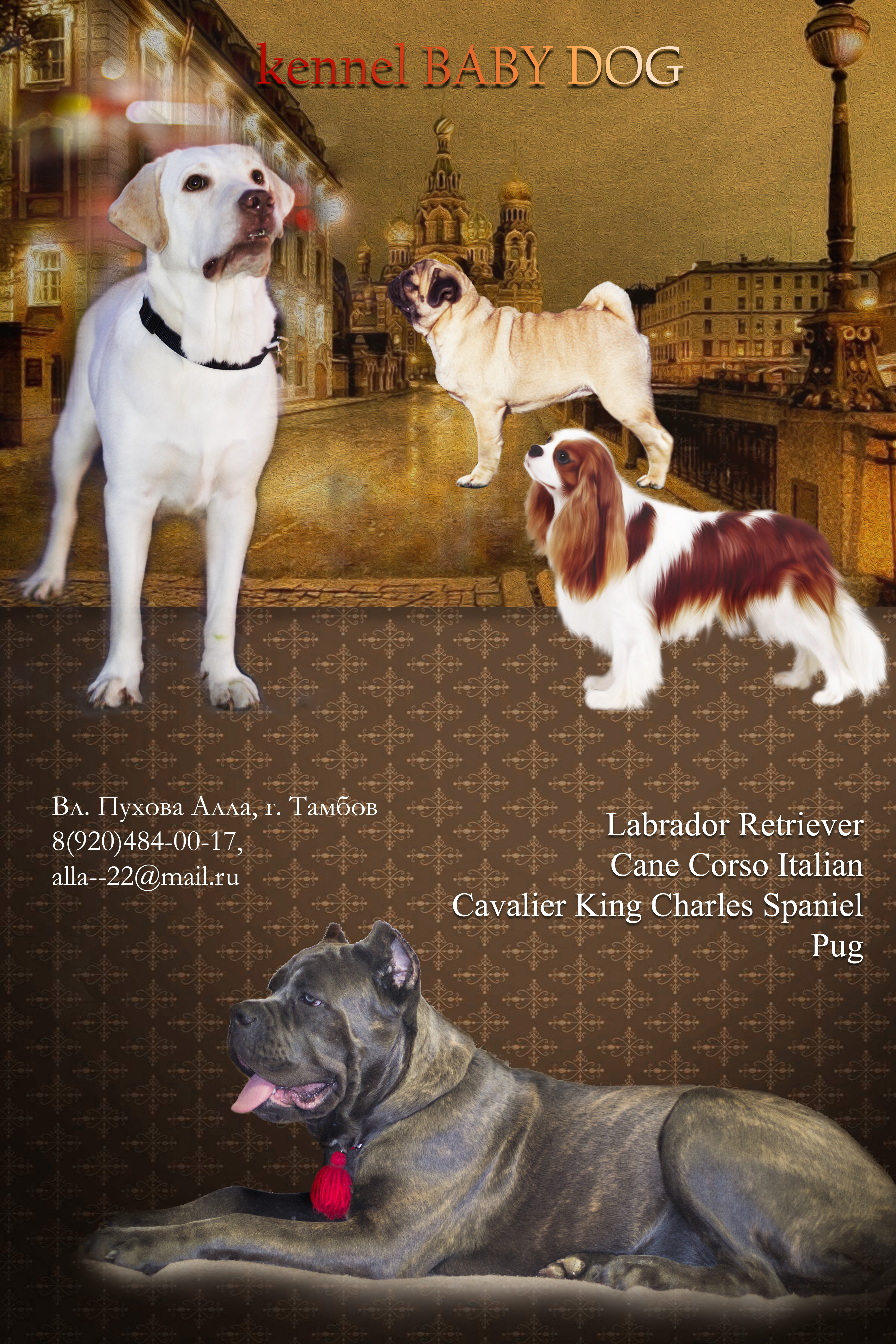 Питомники собак и кошек по породам: Абиссинская кошка  •   Австралийский шелковистый терьер  •   Акита-ину  •   Аляскинский маламут  •   Американская Акита  •   Американский Кокер Спаниель  •   Американский стаффордширcкий терьер  •   Английский бульдог  •   Английский Кокер Спаниель  •   Бенгальская кошка  •   Бигль  •   Бомбейская кошка  •   Британская длинношерстная  •   Британская короткошерстная  •   Брюссельский гриффон  •   Бульмастиф  •   Бурма  •   Велш терьер  •   Вельш Корги Кардиган  •   Вельш Корги Пемброук  •   Восточноевропейская овчарка  •   Далматин  •   Девон-рекс  •   Дегу  •   Джек рассел терьер  •   Доберман  •   Донской сфинкс  •   Ирландский волкодав  •   Ирландский терьер  •   Йоркширский терьер  •   Ка де Бо (Майоркский мастиф)  •   Кавалер-кинг-чарльз-спаниель  •   Кавказская овчарка  •   Кане корсо  •   Кеесхонд  •   Колли  •   Корниш-рекс  •   Курильский бобтейл  •   Лабрадудль  •   Лайка Самоедская  •   Левретка  •   Мальтезе  •   Манчкин  •   Мейн-кун  •   Меконгские Бобтейлы  •   Мопс  •   Невская маскарадная  •   Немецкая овчарка  •   Норвежская лесная  •   Норвич-терьер  •   Ориентальная (восточная короткошерстная)  •   Папильон  •   Пекинес  •   Персидская кошка  •   Петерболд  •   Померанский шпиц  •   Пудель большой (королевский)  •   Пудель той  •   Ретривер Лабрадор  •   Ротвейлер  •   Русская голубая кошка  •   Русский той-терьер  •   Рэгдолл  •   Сенбернар  •   Сиба-ину  •   Сибирская кошка  •   Сибирский хаски  •   Среднеазиатская овчарка (Алабай)  •   Стаффордширский бультерьер  •   Сфинкс (Канадский сфинкс)  •   Тайская кошка  •   Такса  •   Той-бобтейл  •   Французский бульдог  •   Цвергпинчер  •   Цвергшнауцеры  •   Чау-чау  •   Черный терьер  •   Чихуахуа  •   Шарпей  •   Ши-тцу  •   Шиншилла Длиннохвостая (Береговая шиншилла)  •   Шотландская длинношерстная (Хайленд-страйт)  •   Шотландская длинношерстная вислоухая (Хайленд - фолд)  •   Шотландская короткошерстная (Cкоттиш-страйт)  •   Шотландская короткошерстная вислоухая (Скоттиш-страйт)  •   Экзотическая короткошерстная  •   Южнорусская овчарка  •   Японский шпиц  •